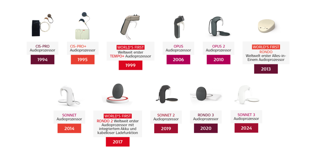 In 1977, Prof. Dr. Kurt Burian used a cochlear implant for a deaf patient at the Vienna University Hospital (AKH). Since then, the implants have continuously evolved. Parallel to the implants, the audio processors have also been repeatedly adapted to the current state of the art technology. Innovative coding strategies and so-called adaptive intelligence, direction-dependent microphone systems and noise suppression enable an increasingly natural listening experience.