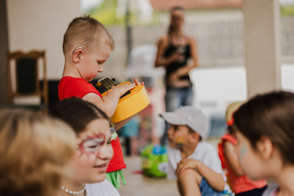 Chlapec s načúvacími prístrojmi skúša, ako znejú rôzne hudobné nástroje (vnímanie rôznych zvukov je taktiež základ sluchovej výchovy)