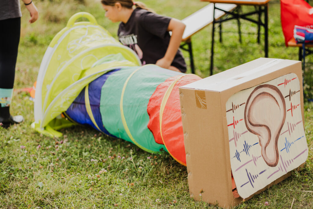 [6] Inšpirované občianskym združením Umenie počuť: hra – prechod „uchom“ až k vnútornému slimákovi (kochley) cez tunel, na ktorého konci sú buď dvierka zatvorené (ukazujúc na poruchu sluchu – že sa zvuk nedostane k slimákovi) alebo otvorené (ak je sluch v poriadku alebo je porucha kompenzovaná dostačujúcimi kompenzačnými pomôckami). Keď sa deti dostanú cez dvierka ku kochley (znázornenej na podlahe), zistia, že na jej začiatku je možné počuť vysoké tóny a postupne ku koncu hlboké tóny. Tieto tóny demonštruje zvuková hračka, ale i hudobné nástroje s rôznou výškou tónov umiestnené na kochlei.