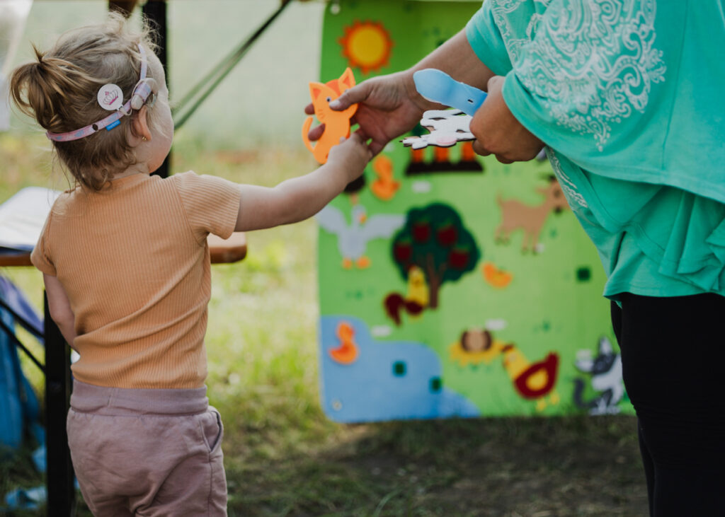 Chlapec s načúvacími prístrojmi skúša, ako znejú rôzne hudobné nástroje (vnímanie rôznych zvukov je taktiež základ sluchovej výchovy)
